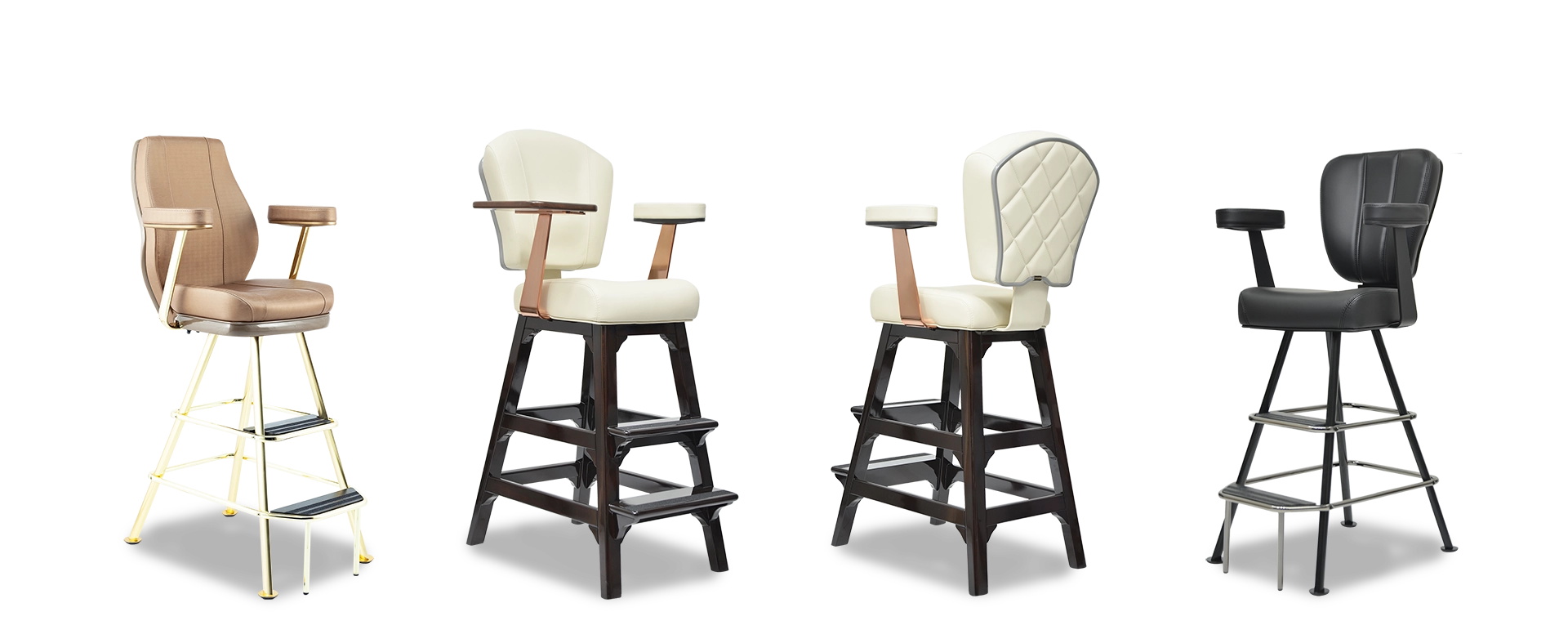 The sturdy base frame made of high-quality brass ensures excellent stability while adding a warm, refined visual appeal. The integrated multi-level footrests offer secure and comfortable access. With a seat height of 90 cm, the Mod. 952 Inspector is perfectly aligned with live-gaming tables and dealer stations.